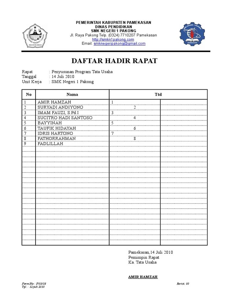 No, nama, jabatan, tanda tangan. Kegiatan rapat dinas sekolah yang dimaksud adalah semua kegiatan rapat seperti rapat orang tua siswa wali murid rapat guru rapat. Pemerintah kota bukittinggi sekretariat daerah jalan kesuma bhakti bukit gulai bancah telepon: Download format daftar hadir rapat kegiatan peserta rapat ataupun peserta pelatihan siswa karyawan dan rapat dinas revisi terbaru 2018 doc sekolah ini yang . Bagi yang ingin mendownload contoh surat/arsip surat/format daftar hadir diatas dalam bentuk excel silahkan ambil di google drive dibawah .